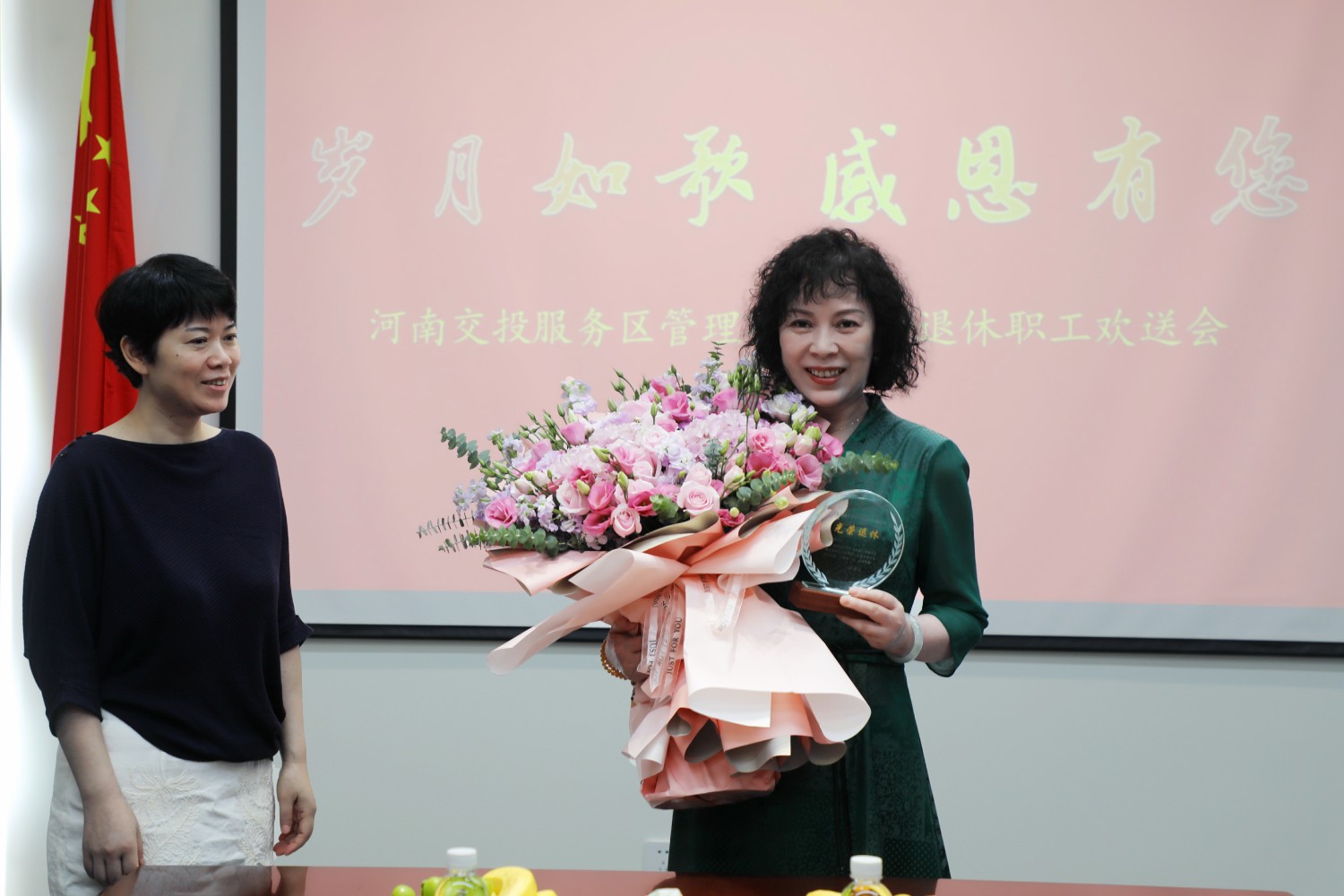歡送會上,高納副總經(jīng)理為退休職工送上了鮮花和紀(jì)念品,表達(dá)了真摯的祝愿,希望退休職工繼續(xù)保持高昂樂觀的生活熱情,退休不褪色,一如既往關(guān)心支持公司工作,積極建言獻(xiàn)策。