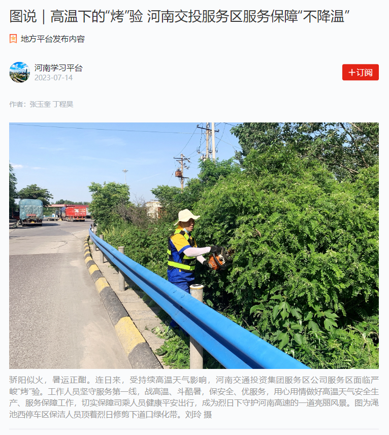 來源: 本站 發(fā)布時間: 2023-07-147月14日,“學(xué)習(xí)強國河南學(xué)習(xí)平臺” 以“高溫下的’烤’驗 河南交投服務(wù)區(qū)服務(wù)保障‘不降溫‘”為題,對公司所屬服務(wù)區(qū)、加油站做好高溫天氣安全生產(chǎn)、服務(wù)保障工作進(jìn)行了宣傳報道。